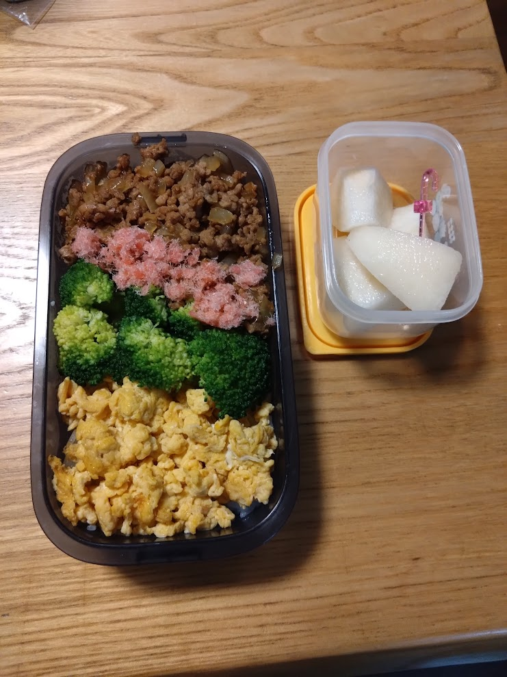 4色とは、ひき肉と刻み玉ねぎの甘辛炒め・さくらでんぶ・ブロッコリーの塩ゆで・いり卵。